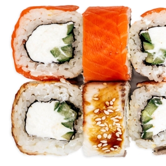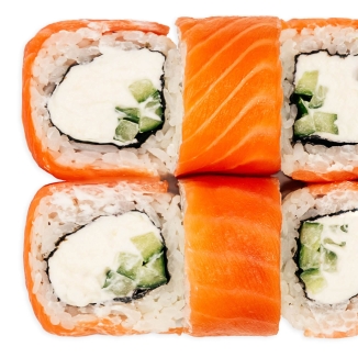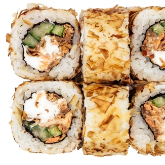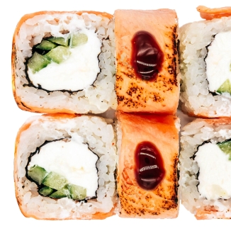 рис, нори, лосось, соус унаги, огурец, соус спайси, соус ореховый, сыр сливочный, стружка тунца