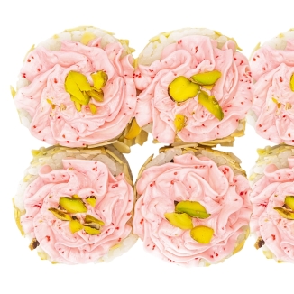 рис, нори, лосось, омлет, авокадо, соус лава, лепестки миндаля, стружка фисташки